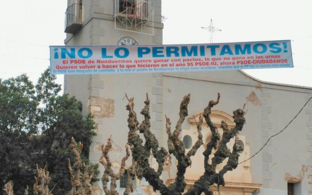 La pancarta está situada en la puerta de la Iglesia de Nonduermas e invita a la resistencia para impedir que se celebre la moción de censura que han firmado los vocales del PSOE y Ciudadanos de esta pedanía, en la que el Partido Socialista y el Partido Popular obtuvieron 4 vocales cada uno, mientras que Ciudadanos consiguió un representante.